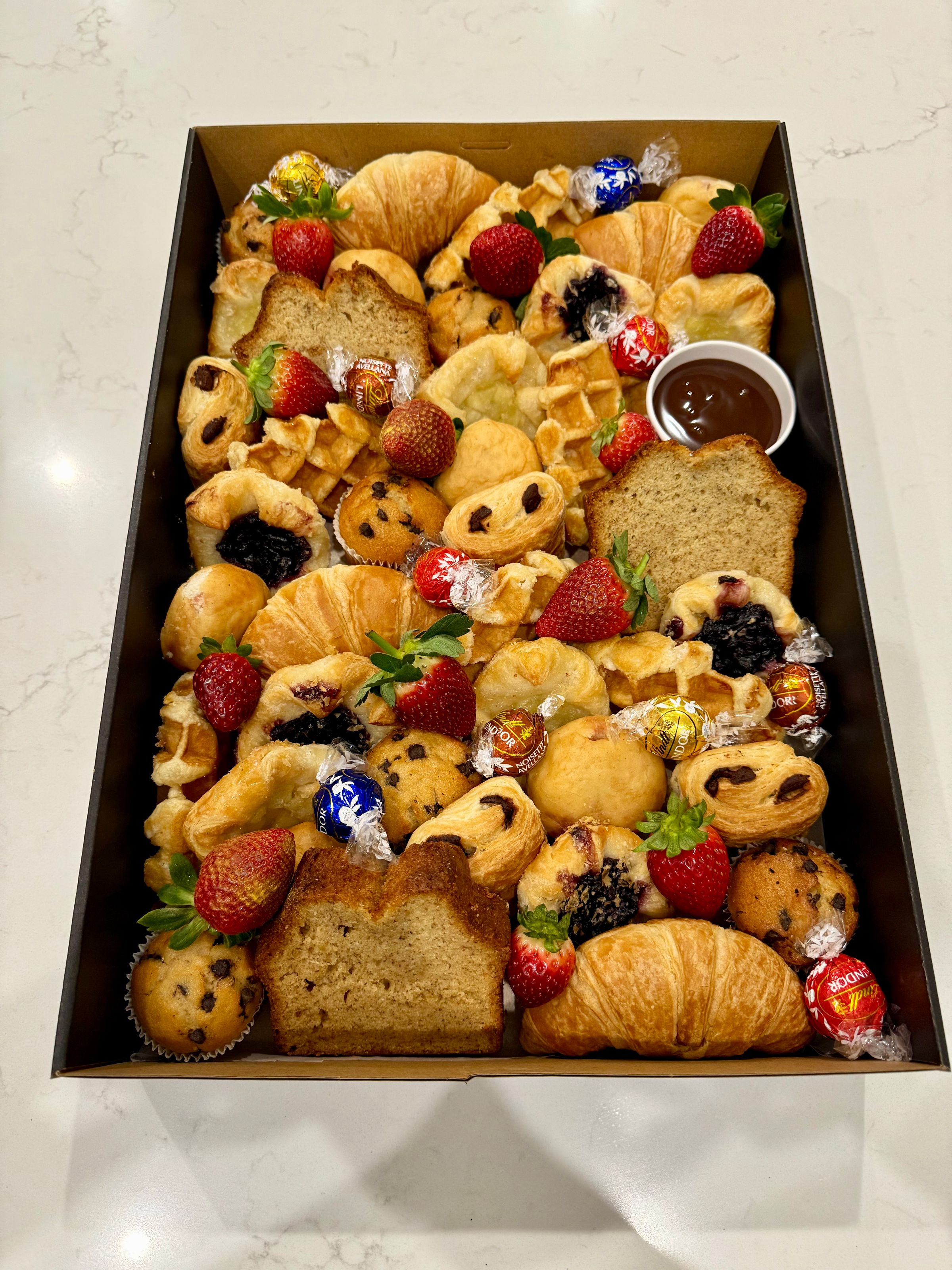 Indulge in the sweet elegance of our Gourmet Dessert Box, featuring a delightful assortment of freshly baked treats. From buttery croissants and fluffy muffins to golden waffles and flaky danishes, perfectly paired with a selection of fresh seasonal berries and rich chocolate sauce. Perfect for sharing, gifting, or enjoying with a coffee, this box brings a touch of gourmet sweetness to any moment.